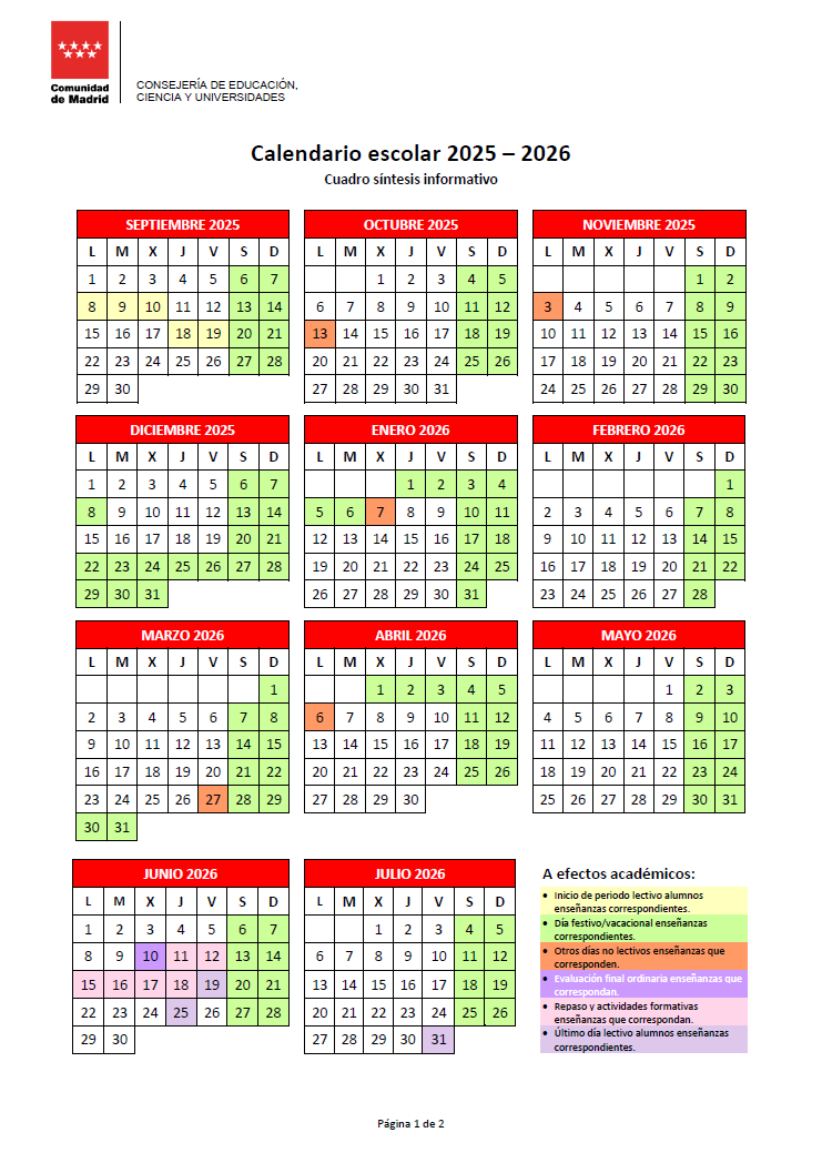 Este es el calendario escolar para el curso 2025 – 2026.