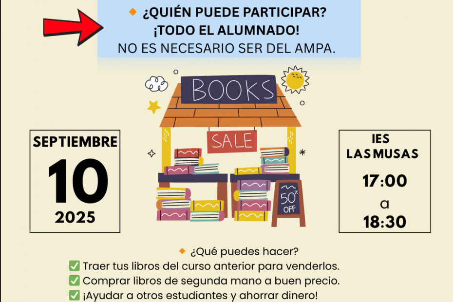 El próximo miércoles 10 de septiembre de 17 a 18:30 h, puedes venir a vender y comprar tus libros de bachillerato. Este mercadillo está abierto a todo… Leer más »MERCADILLO DE LIBROS DE BACHILLERATO